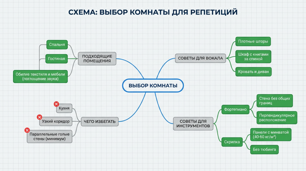 Любая комната — инструмент, и у инструмента есть тембр. Пустая комната звенит, как кастрюля, а спальня с ковром и гардинами гасит хвосты реверберации. Практика школы показывает: для вокала идеально, когда шторы плотные, шкаф с книгами стоит за спиной, а кровать и диван глотают низ и середину. Для фортепиано выбирают стену без общих границ с соседями или хотя бы ставят инструмент перпендикулярно к ней. Скрипке полезна комната без «тюбинга» — убирают голые панели, добавляют пару панелей с минеральной ватой плотности 40–60 кг/м³ в тканевых чехлах. И ещё деталь: выше потолок — спокойнее высокие частоты, но слишком высокий тянет хвост, значит мягкие подвесные панели выручают.