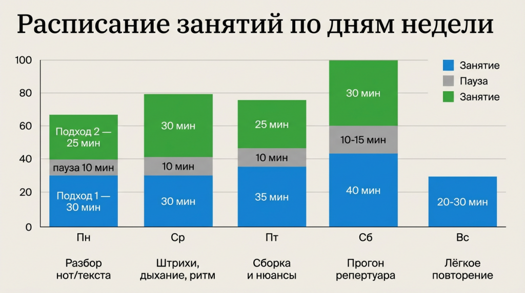 | Пн | 30 мин | 10 мин | 25 мин | разбор нот/текста |