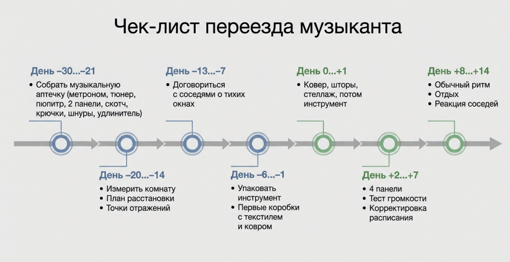 Переезд — не враг музыке, если разбить на шаги. Это помогает и тем, кто подбирает новую квартиру, и тем, кто временно живёт на коробках. Простой сценарий обеспечивает непрерывность занятий вокалом и инструмента без скачков качества, а соседи видят внятность процесса и расслабляются. Вот как действовать: